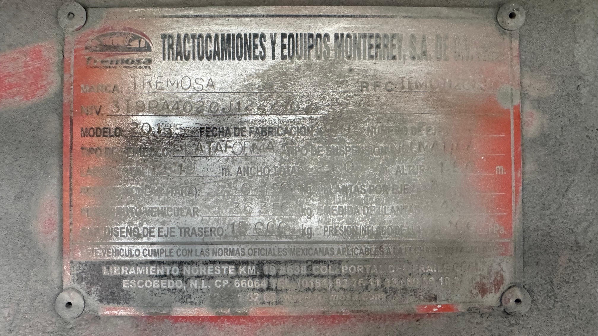 Observacion: PLATAFORMA DE 40 PIES DE 3 EJES MARCA TREMOSA MODELO2016 CON SUSPENCION DE AIRE, FRENOS ABC, LISTA PARA TRABAJAR |